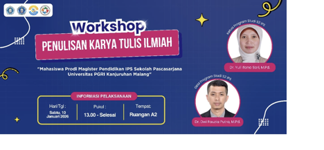 Program Studi Magister Pendidikan IPS Sekolah Pascasarjana Universitas PGRI Kanjuruhan Malang menyelenggarakan kegiatan Workshop Penulisan Karya Tulis Ilmiah yang diperuntukkan bagi mahasiswa S2 Pendidikan IPS. Kegiatan ini dilaksanakan pada Sabtu, 10 Januari 2026, bertempat di Ruangan A2, mulai pukul 13.00 WIB hingga selesai.
